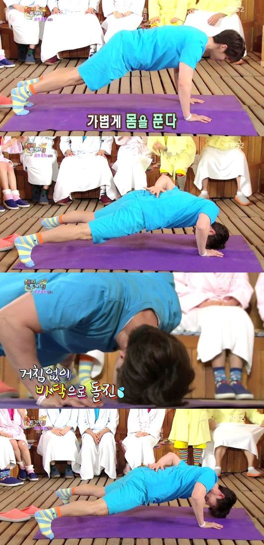 '해피투게더3' 송재림이 푸쉬업을 하다가 바닥에 머리를 부딪혔다.