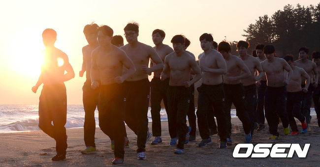 27일 오후 강원도 삼척시 증산해수욕장에서 열린 핸드볼 국가대표 남자 대표팀 첫 촌외훈련에서 둘째날 일정에서 구보를 하고 있다.
