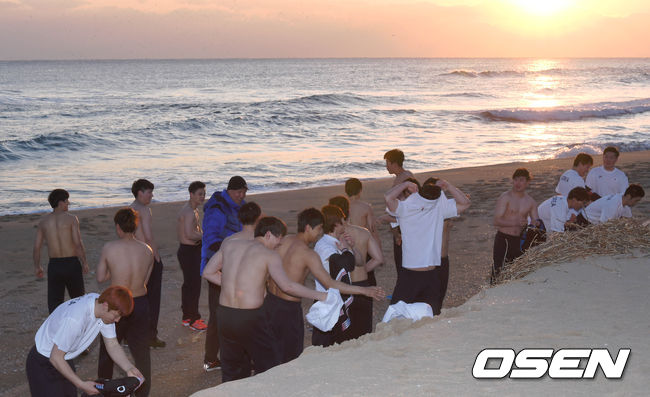 27일 오후 강원도 삼척시 증산해수욕장에서 열린 핸드볼 국가대표 남자 대표팀 첫 촌외훈련에서 둘째날 일정에서 선수들이 입수를 위해 상의를 탈의하고 있다.