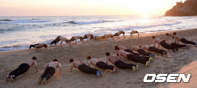 27일 오전 강원도 삼척시 증산해수욕장에서 열린 핸드볼 국가대표 남자 대표팀 첫 촌외훈련에서 둘째날 일정에서 선수들이 훈련하고 있다.