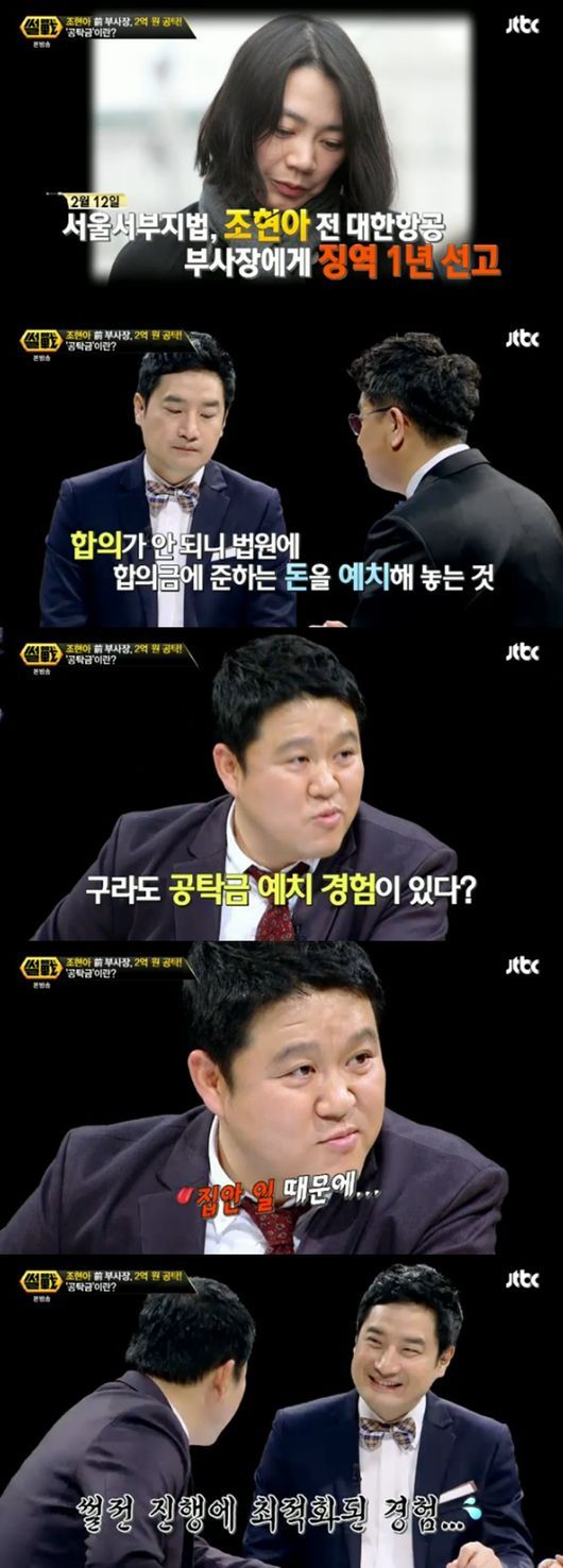 지난 26일 방송된 JTBC ‘썰전’의 하드코어 뉴스 깨기 코너에서 김구라는 강용석, 이철희와 ‘땅콩회항’으로 실형 선고를 받은 조현아 전 대한항공 부사장의 공탁금에 대한 얘기를 나눴다.