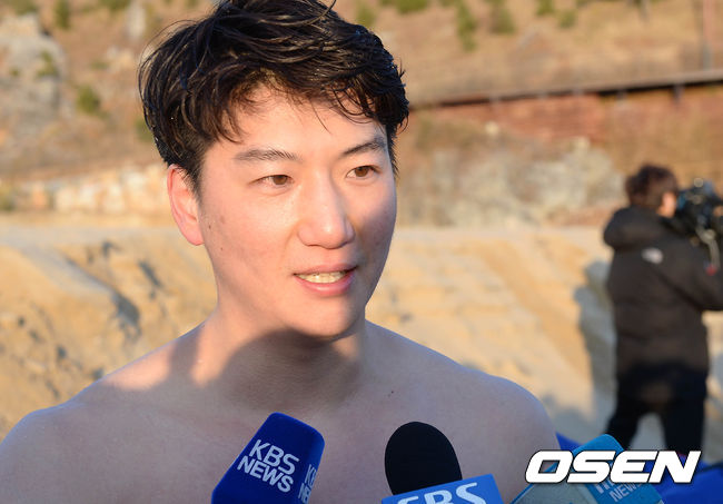 27일 오전 강원도 삼척시 증산해수욕장에서 열린 핸드볼 국가대표 남자 대표팀 첫 촌외훈련에서 둘째날 일정에서 주장 정의경이 입수후 인터뷰에 임하고 있다.