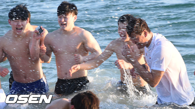 27일 오전 강원도 삼척시 증산해수욕장에서 열린 핸드볼 국가대표 남자 대표팀 첫 촌외훈련에서 둘째날 일정에서 선수들이 감독에게 물을 뿌리고 있다.