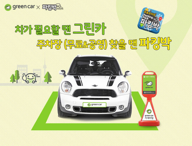 그린카는 와이즈모바일의 최저가 주차장 소개 앱 '파킹박(ParkingPark)'과 제휴를 맺고 보다 편리한 카셰어링 서비스 확대에 나선다고 27일 밝혔다.