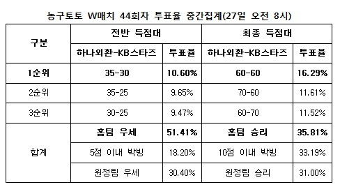 국민체육진흥공단(www.kspo.or.kr)이 발행하는 체육진흥투표권 공식 인터넷 발매사이트 베트맨(www.betman.co.kr)이 오는 28일 오후 7시 부천실내체육관에서 벌어지는 하나외환-KB스타즈전을 대상으로 한 농구토토 W매치 44회차 투표율을 중간 집계한 결과, 전체 참가자의 35.81%가 하나외환의 승리를 예상하는 것으로 나타났다.