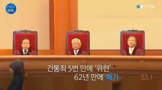 간통죄는 지난 1990년부터 25년 동안 5차례에 걸쳐 헌법재판소 심판을 받았다. 2001년 세 번째 심판까지는 합헌 의견이 위헌 의견보다 2배 이상 우세하게 나오면서 합헌으로 유지됐다가, 마지막 심판이었던 지난 2008년의 경우 위헌 의견이 우세했는데도 정족수가 1명 모자라 가까스로 합헌이 유지됐다.