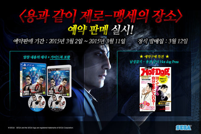SEGA퍼블리싱코리아는 “전 세계 누적 출하 650만 장을 넘긴 ‘용과 같이’ 시리즈의 최신작 ‘용과 같이 제로-맹세의 장소’의 정식 발매에 앞서 3월 2일부터 3월 11일까지 예약 판매를 실시한다”고 27일 밝혔다.