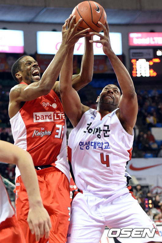 27일 오후 서울 잠실학생체육관에서 열린 '2014-2015 KCC 프로농구' 서울 SK와 안양 KGC의 경기, 1쿼터 SK 헤인즈와 안양 윌리암스가 리바운드 경쟁을 펼치고 있다.