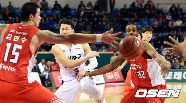 27일 오후 서울 잠실학생체육관에서 열린 '2014-2015 KCC 프로농구' 서울 SK와 안양 KGC의 경기, 2쿼터 안양 최현민이 윌리암스에게 패스를 시도하고 있다.