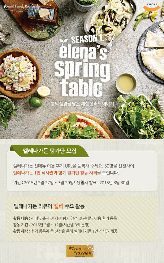 종합외식기업 아모제푸드(회장 신희호, www.amoje.com)에서 운영하는 이탈리안 허브 뷔페 레스토랑 엘레나가든(www.elenagarden.co.kr)은 엘레나가든 평가단인 '엘리('엘'레나가든 '리'뷰어의 줄임말)'를 3월 29일까지 모집한다.