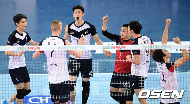 1세트를 승리한 현대캐피탈 선수들이 환호하고 있다.