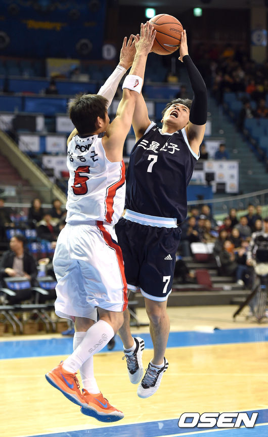 28일 오후 서울 잠실실내체육관서 열린 '2014-2015 KCC프로농구' 서울 삼성과 울산 모비스의 경기, 1쿼터 삼성 박재현의 레이업슛때 울산 양동근이 앞을 가로막고 있다.