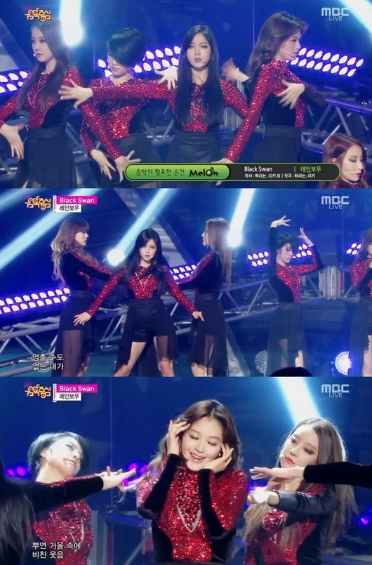 레인보우는 28일 오후 방송된 MBC ‘쇼, 음악중심’에서 타이틀곡 ‘블랙 스완’을 열창, 화려한 무대를 꾸몄다.