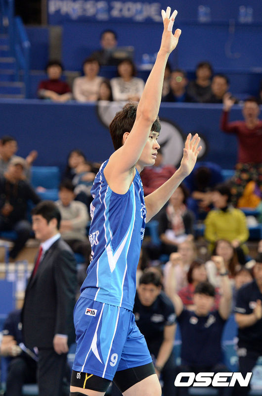 4세트 블로킹에 성공한 이선규가 환호하고 있다.