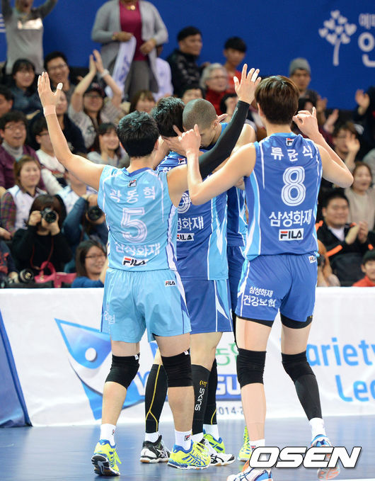 5세트 삼성화재 선수들이 득점에 환호하고 있다. /sunday@osen.co.kr