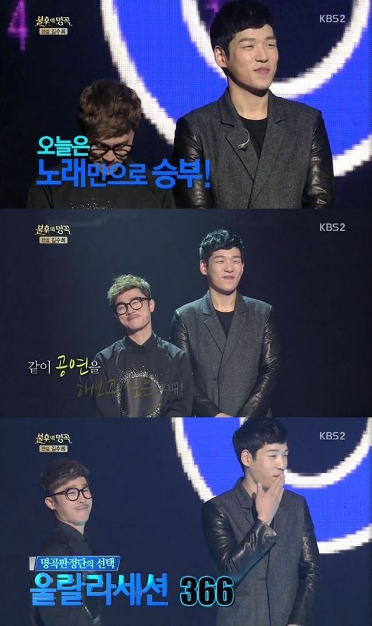울랄라세션은 28일 오후 방송된 KBS 2TV 예능프로그램 '불후의 명곡'에서 김수희의 '너무합니다'로 366표를 받아 조정민을 제치고 1승을 거뒀다.