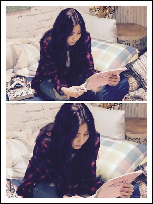 유이는 28일 소속사 플레디스가 공개한 사진에서 빨간색 체크무늬 셔츠를 입고 침대에 앉아 대본을 열심히 보는 모습을 보여주고 있다.