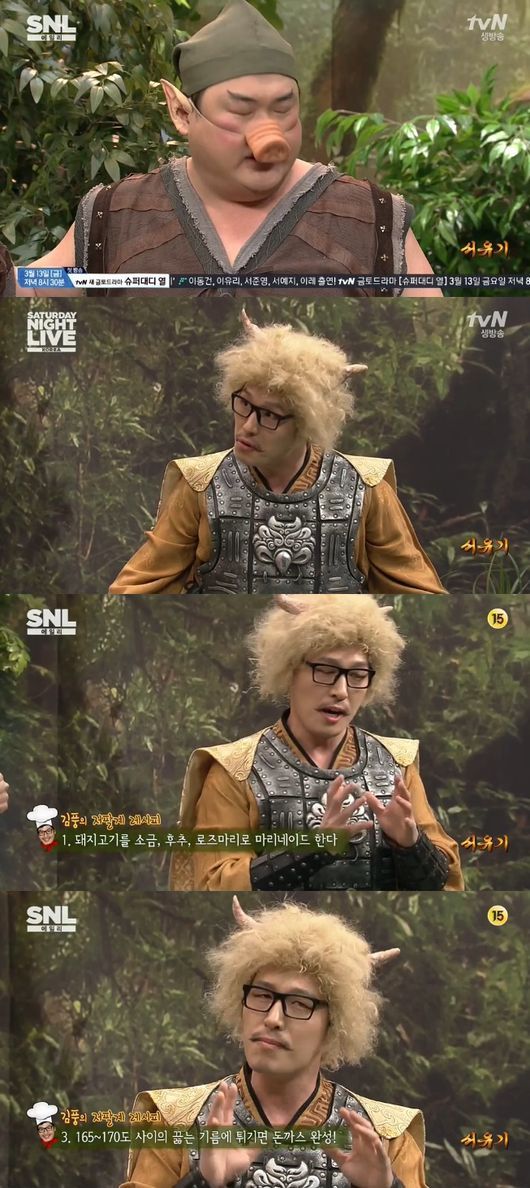 이에 괴물 김풍이 나타났고 저팔계 레시피를 소개했다. 저팔계 레시피는 돈가스를 만드는 방법. 김풍은 "고기를 튀길 때 170도를 넘기면 빵가루가 탈 수 있으니 주의해야 한다"고 설명해 웃음을 자아냈다.