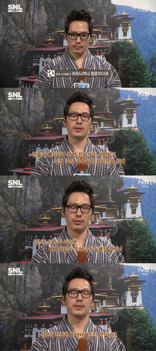 이날 'SNL 코리아'에서는 간통죄 위헌 결정에 대해 언급했다. 이에 김풍은 부탄의 시사평론가로 등장했다.