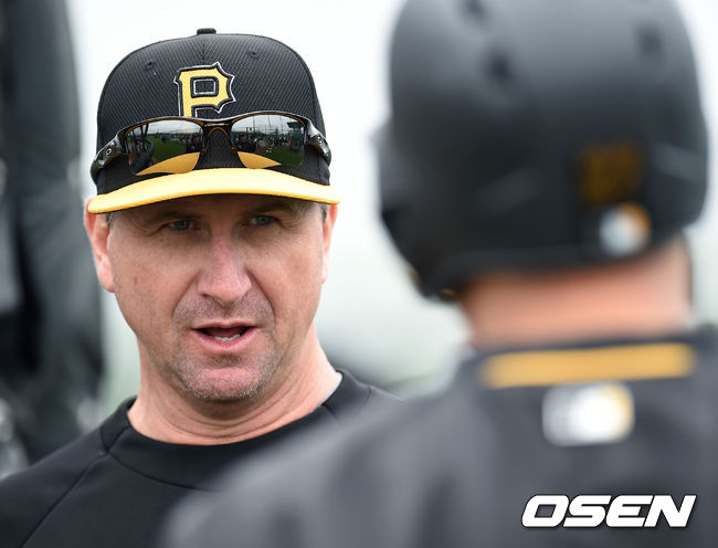 제프 브랜슨 코치가 강정호와 이야기를 나누고 있다.