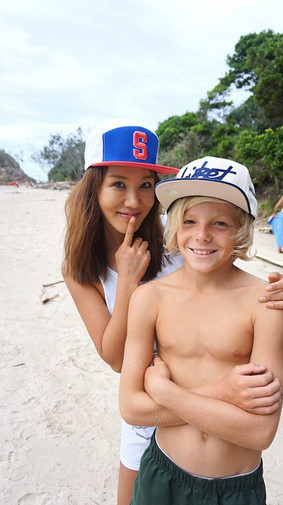 공개된 사진 속 엄정화는 예쁘장한 금발 머리 소년의 어깨에 손을 올린 채 수줍은 듯 미소 짓고 있는 모습이다. 특히 그는 스냅백과 수영복 패션으로