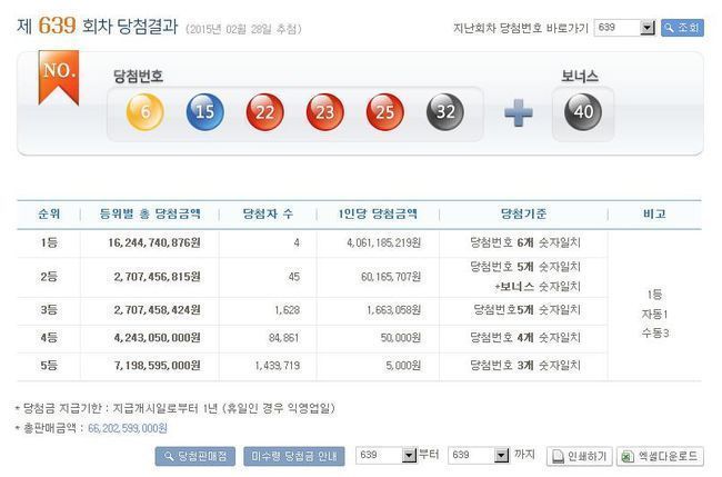 로또639회당첨번호, 40억 행운의 주인공 4명