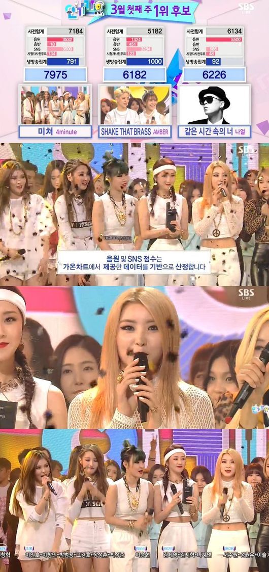 포미닛은 1일 방송된 SBS '인기가요'에서 '미쳐'로 나얼, 엠버와의 1위 경합을 뚫고 2주 연속 뜻 깊은 1위 트로피를 거머쥐었다.