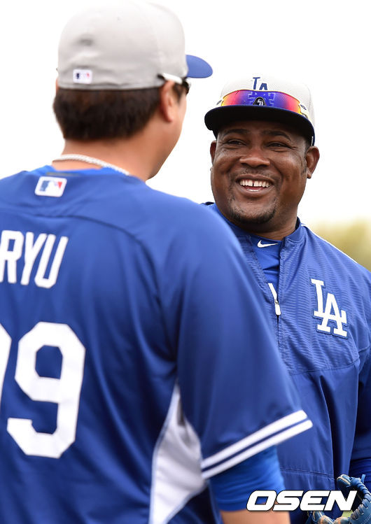 수비훈련을 하던 유리베가 류현진과 이야기를 나누고 있다.