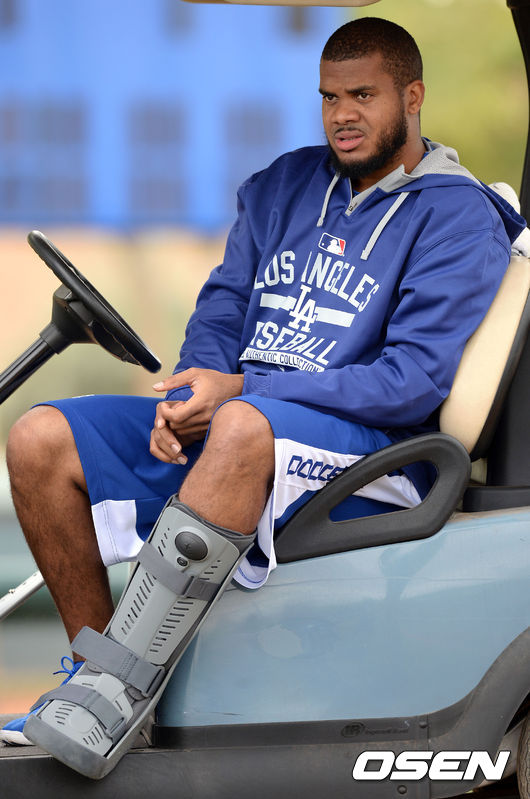 발목 수술을 한 켄리 잰슨이 선수들으 훈련을 지켜보고 있다.