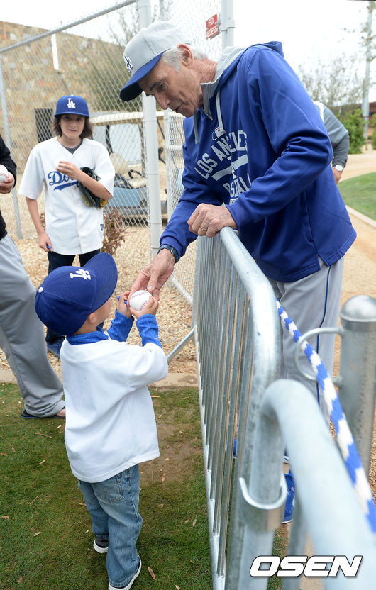 샌디 쿠팩스가 어린 아이에게 사인을 해주고 있다.