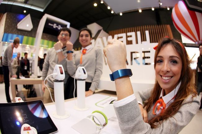 2일 MWC SK텔레콤 부스에서 도우미들이 '스마트 밴드', 'T키즈폰 준' 등 라이프웨어 제품을 시연하고 있는 모습. / SK 텔레콤 제공.