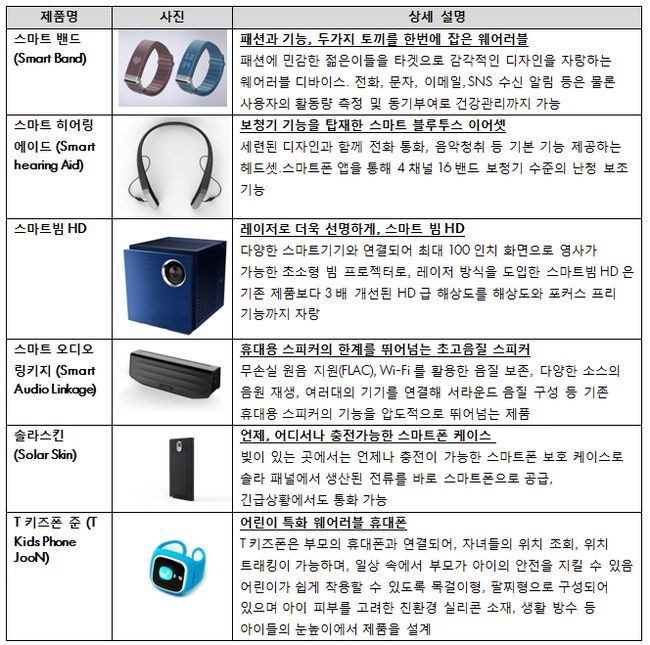 SK텔레콤은 이번 'MWC 2015'에서 ▲건강(Wellness) ▲ 엔터테인먼트(비디오/오디오) ▲안전(Safety) 등 개인의 생활과 밀접하게 연관되어 있는 분야의 다양한 라이프웨어 제품을 선보인다. 특히 이번 전시를 통해 처음 선보이는 패션 웨어러블 기기 스마트 밴드와 함께 스마트빔HD, Wi-Fi오디오 링키지 등 출시를 앞둔 완성형 제품들로 눈길을 끌 전망이다.