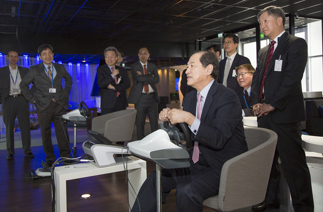 LG유플러스 이상철 부회장(우측 첫번째)과 노키아 경영진이 양사간 기술협력 방안을 논의하고 있는 모습과 아래는 LG유플러스 이상철 부회장이 노키아의 스마트카 서비스를 체험하고 있는 모습. /LG유플러스 제공.