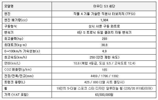 '아우디 S3 세단'은 최고 성능(Sovereign Performance)'이란 뜻의 모델명 'S'를 차용한 아우디 'A3' 세단의 고성능 버전으로 일상에서도 즐길 수 있는 고성능 차량이다. 2리터 터보차저 직분사 TFSI 가솔린 엔진과 6단 S트로닉 자동변속기, 상시 사륜구동 시스템 콰트로가 조화를 이뤄 최고출력 293 마력, 최대토크 38.8kg∙m의 강력한 성능으로 최고속도 250km/h 이며 정지상태에서 시속 100km/h까지 가속성능은 4.9초이다.