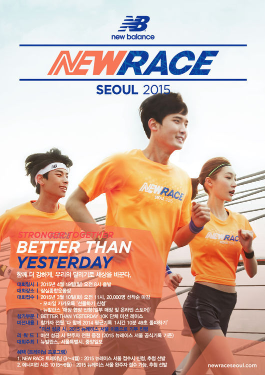 글로벌 스포츠 브랜드 뉴발란스(NEW BALANCE)는 오는 4월 19일 서울 잠실 종합운동장에서 열리는 '2015 뉴레이스 서울' 참가접수를 오는 10일 오전 11시부터 선착순 2만 명에 한해 신청 받는다고 발표했다.