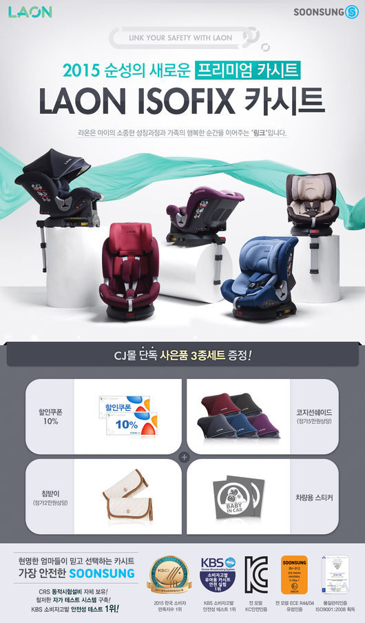 유아용 카시트 전문 기업 ㈜순성산업(대표 이덕삼, www.soonsung.com)은 오는 2일부터 7일간 온라인 종합 쇼핑몰 CJ몰에서 2015 ISOFIX 전용 프리미엄 카시트 라온(LOAN) 론칭 기념 단독 기획전을 진행한다고 26일 밝혔다.