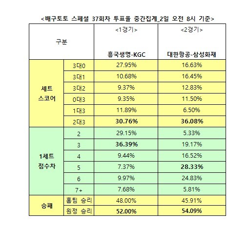 국민체육진흥공단(www.kspo.or.kr)이 발행하는 체육진흥투표권 공식 인터넷 발매사이트 베트맨(www.betman.co.kr)이 오는 3일(화) 열리는 2014-15시즌 국내프로배구(V리그)를 대상으로 한 배구토토 스페셜 37회차 투표율 중간집계 결과, 국내 배구팬 54.09%는 대한항공-삼성화재(2경기)전에서 삼성화재의 우세를 전망했다고 밝혔다.