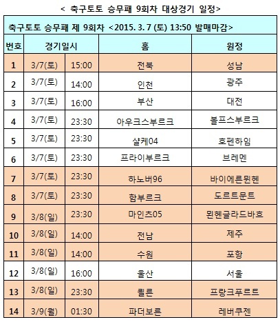 축구토토 승무패 9회차 게임은 7일 오후 1시 50분에 발매가 마감되며 공식 인터넷 발매사이트 베트맨에서 일정을 확인할 수 있다.