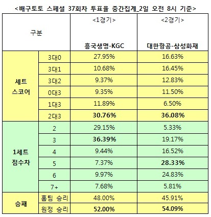 [배구토토] 국민체육진흥공단(www.kspo.or.kr)이 발행하는 체육진흥투표권 공식 인터넷 발매사이트 베트맨(www.betman.co.kr)이 오는 3일 열리는 2014-15시즌 국내프로배구(V리그)를 대상으로 한 배구토토 스페셜 37회차 투표율 중간집계 결과, 국내 배구팬 54.09%는 대한항공-삼성화재(2경기)전에서 삼성화재의 우세를 전망했다고 밝혔다.