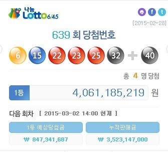 지난 2월 28일 나눔로또에 의하면 로또639회당첨번호는 '6, 15, 22, 23, 25, 32'로 결정됐다. 보너스 번호는 '40'.