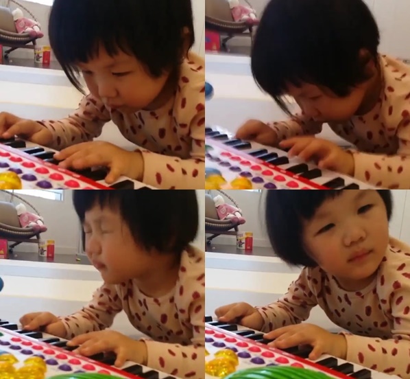영상 속에는 장난감 키보드를 두드리며 리듬에 맞춰 머리를 앞뒤로 흔드는 엄지온의 모습이 담겼다. 엄지온의 사뭇 진지한 표정이 웃음을 자아낸다.