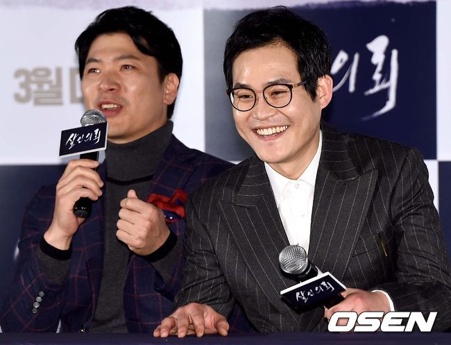 배우 김상경과 김성균이 2일 오후 서울 행당동 CGV 왕십리에서 열린 영화 '살인의뢰' (감독 손용호) 언론시사회에 참석해 취재진의 질문에 답하고 있다.