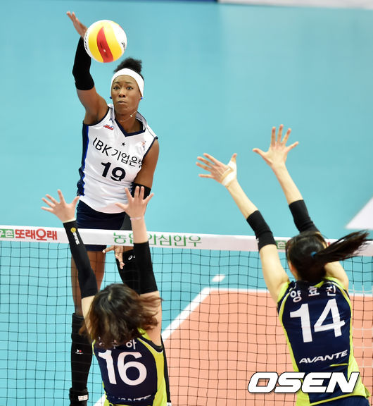 2일 오후 수원실내체육관에서 2014-2015 NH농협 V-리그 여자부 6라운드 현대건설과 IBK기업은행의 경기가 열렸다. 1세트 IBK 데스티니가 강타를 날리고 있다.