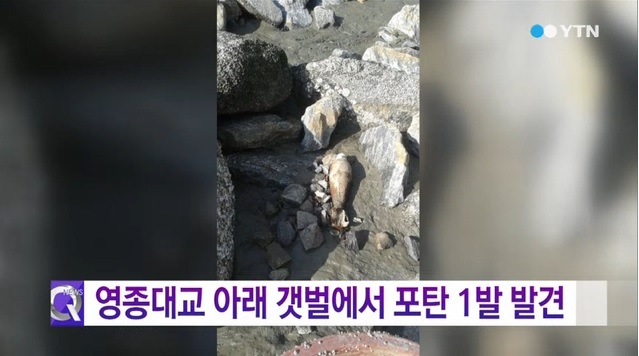 인천 중부경찰서는 2일 오전 11시 10분쯤 인천 영종대교 아래 갯벌에서 포탄으로 보이는 물체가 발견됐다는 신고가 접수됐다고 밝혔다.