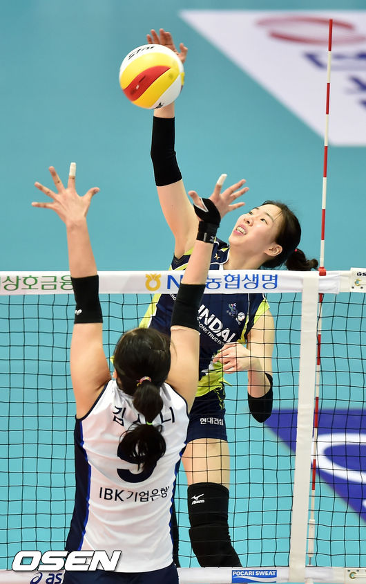 2일 오후 수원실내체육관에서 2014-2015 NH농협 V-리그 여자부 6라운드 현대건설과 IBK기업은행의 경기가 열렸다. 3세트 현대건설 고유민이 강타를 날리고 있다.
