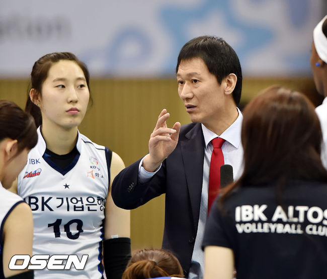 2일 오후 수원실내체육관에서 2014-2015 NH농협 V-리그 여자부 6라운드 현대건설과 IBK기업은행의 경기가 열렸다. 3세트 IBK기업은행 이정철 감독이 작전을 설명하고 있다.