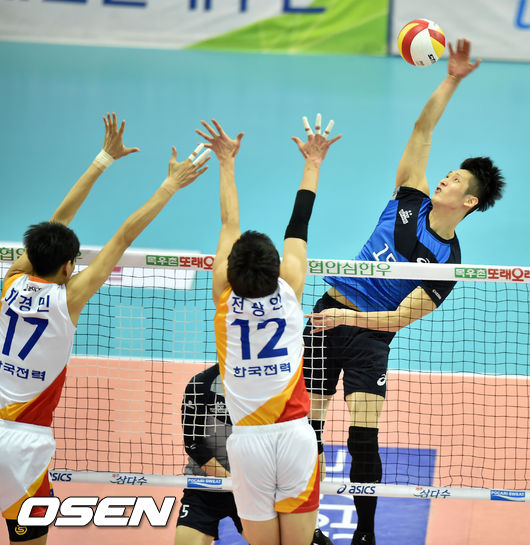 2일 오후 수원실내체육관에서 2014-2015 NH농협 V-리그 남자부 한국전력과 현대캐피탈의 경기가 열렸다. 1세트 현대캐피탈 문성민이 강타를 날리고 있다.