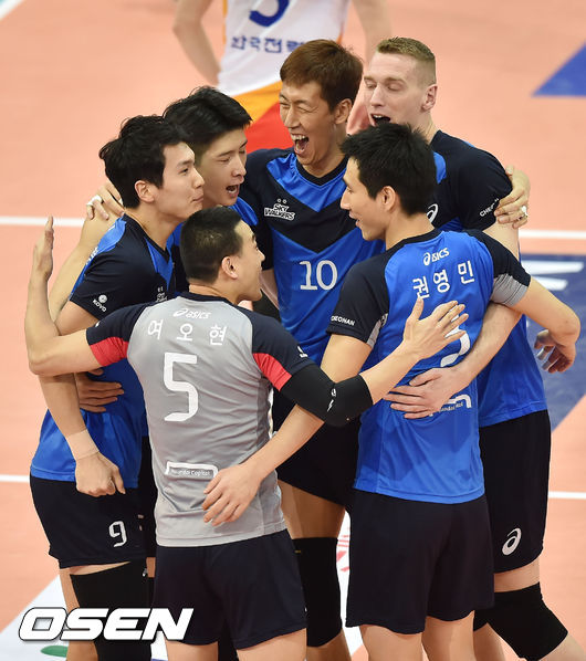 2일 오후 수원실내체육관에서 2014-2015 NH농협 V-리그 남자부 한국전력과 현대캐피탈의 경기가 열렸다. 1세트 현대캐피탈 선수들이 공격에 성공한 후 기뻐하고 있다.