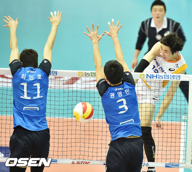 2일 오후 수원실내체육관에서 2014-2015 NH농협 V-리그 남자부 한국전력과 현대캐피탈의 경기가 열렸다. 1세트 한국전력 전광인이 강타를 날리고 있다.