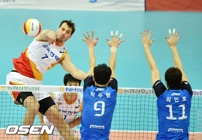 2일 오후 수원실내체육관에서 2014-2015 NH농협 V-리그 남자부 한국전력과 현대캐피탈의 경기가 열렸다. 1세트 한국전력 쥬리치가 강타를 날리고 있다.